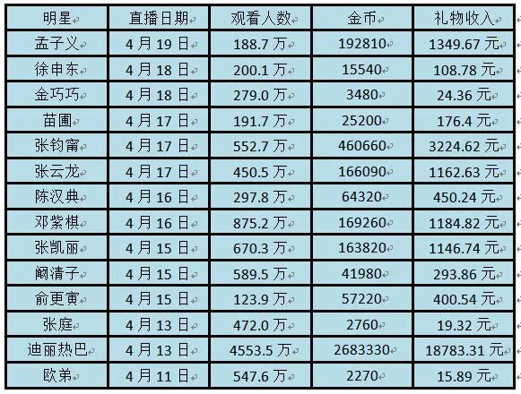 近来兴起的直播便成为小众明星的变现方式之一,阚清子、陈汉典、俞更寅等单日单平台直播收入在300-400元之间。