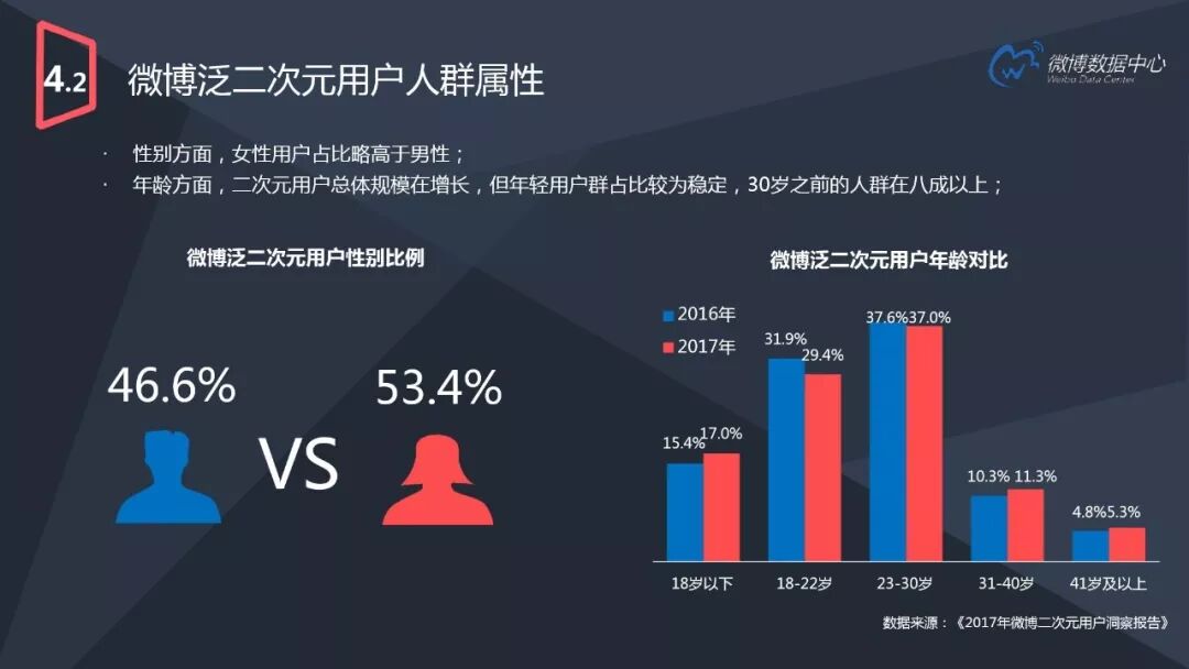 《2017年微博二次元用户洞察报告》也显示,微博二次元用户群体中,22岁以下的人群占比在46%以上,将近一半。据了解,截至2017年9月底,微博日活跃用户已达1.65亿。