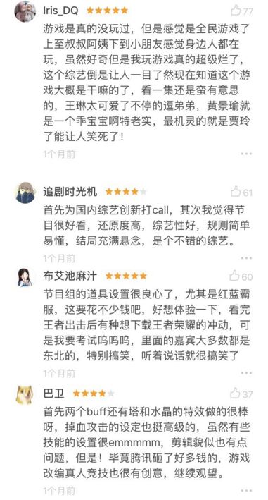 其实这也是游改综艺最容易存在的问题,对于《王者荣耀》的重度玩家来说,肯定是对“王者IP”有着深厚的情感牵连,因此“爱之深,责之切”,他们理想中的《王者出击》一定是非常完美的,对《王者荣耀》还原度相当高的一档综艺。