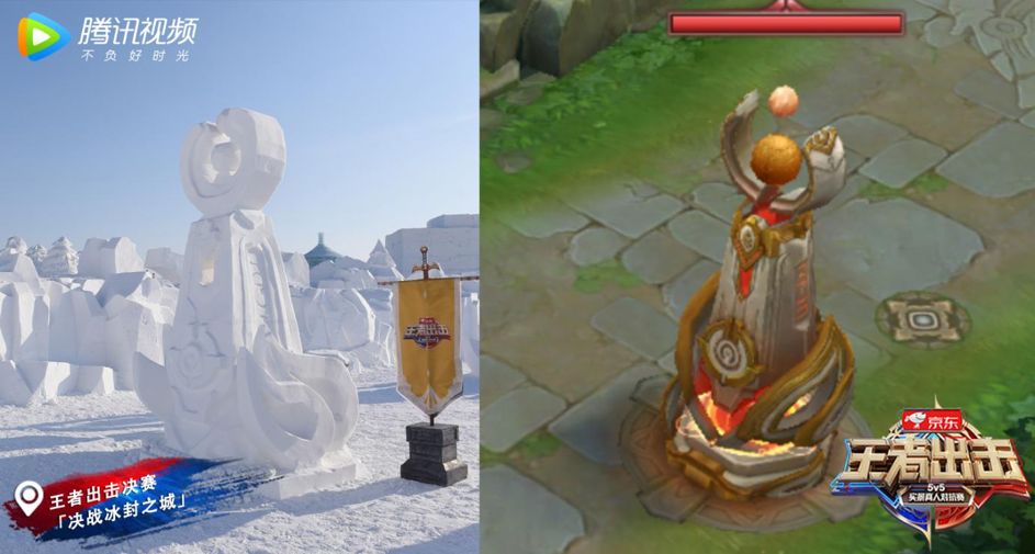 特别是最后一期决赛,哈尔滨冰雪大世界场地的选定,让节目组得以充分利用冰雕的高可塑性,100%还原《王者荣耀》游戏中经典的5V5对战场景,将游戏粉的热情彻底点燃,也反向点燃了已经渐渐熟悉游戏规则的普通观众的热情,甚至有很多非游戏玩家的观众因为看了《王者出击》而去玩《王者荣耀》,实现了综艺IP反哺游戏的效果。