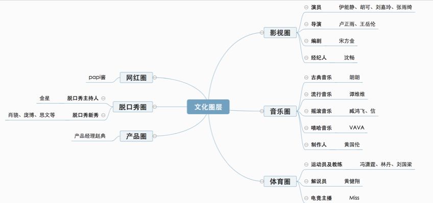 从图中可以看出,从影视圈的演员、导演、编剧、经纪人,到音乐圈的歌手、制作人、钢琴家,再到体育圈的运动员、教练、解说、主播,还有魔术圈的刘谦、网红圈的papi酱、脱口秀圈、产品圈、主持人圈等等,《吐槽大会》第二季中体现的圈层文化更加丰富。