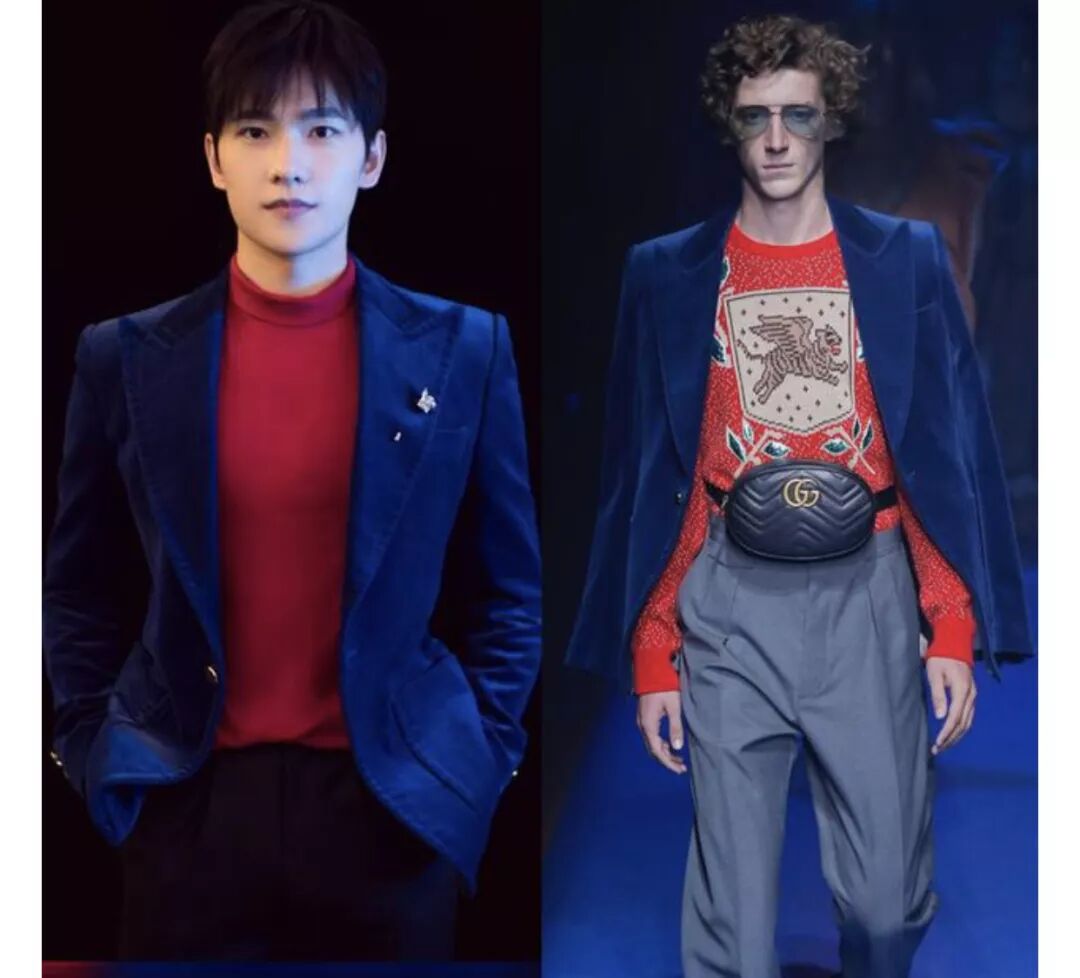 郑恺的西装套装,张艺兴的红色格纹西装,都是Gucci的: