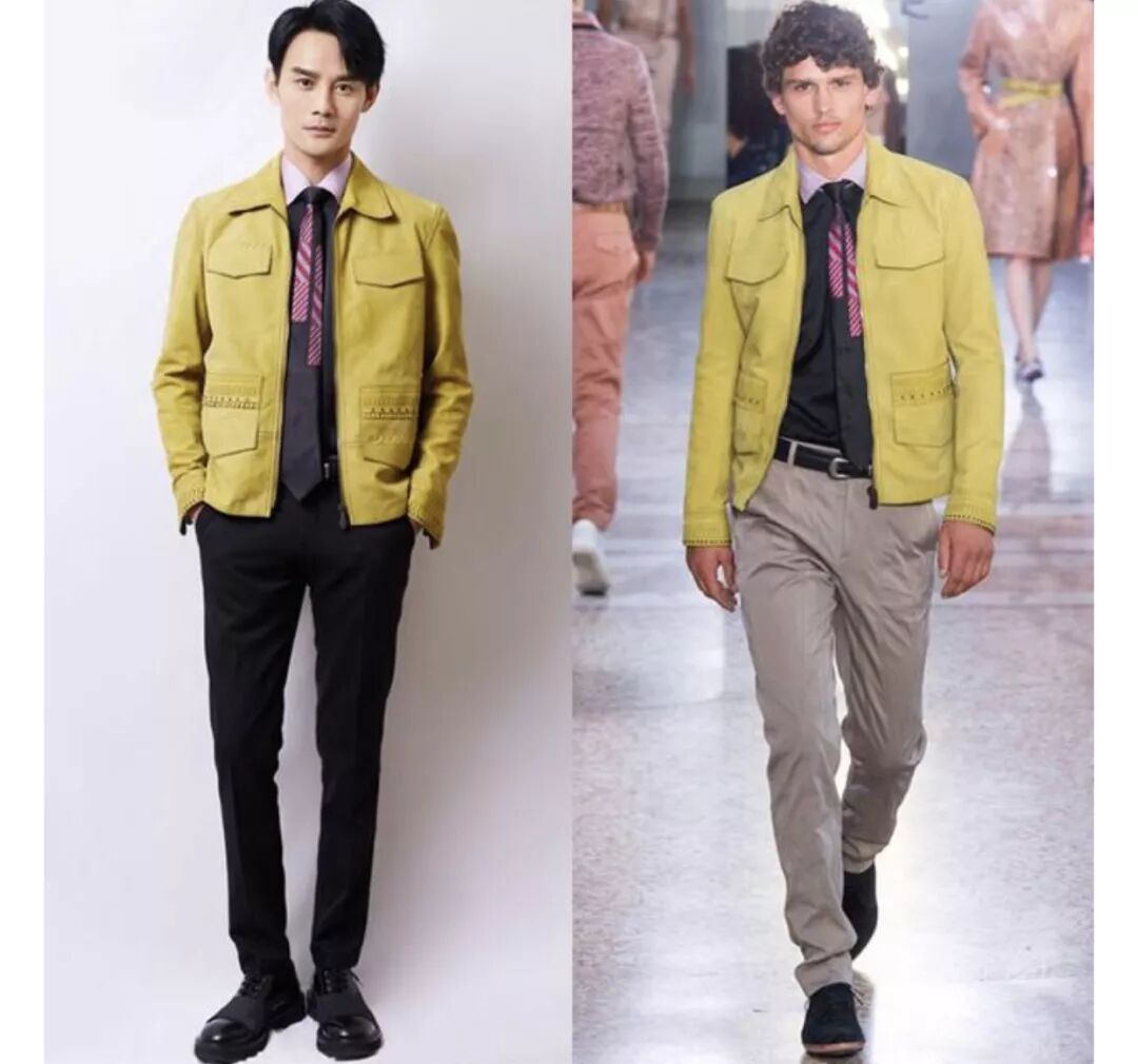 杨洋的西装也是Gucci的2018春夏丝绒款,里面的红色高领衫为Ambush品牌: