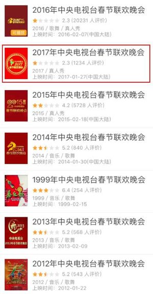 春晚已经厉害到豆瓣不敢开评分了。(2017年的春晚因为评分只有2.3分创新低,所以评分被抹去)