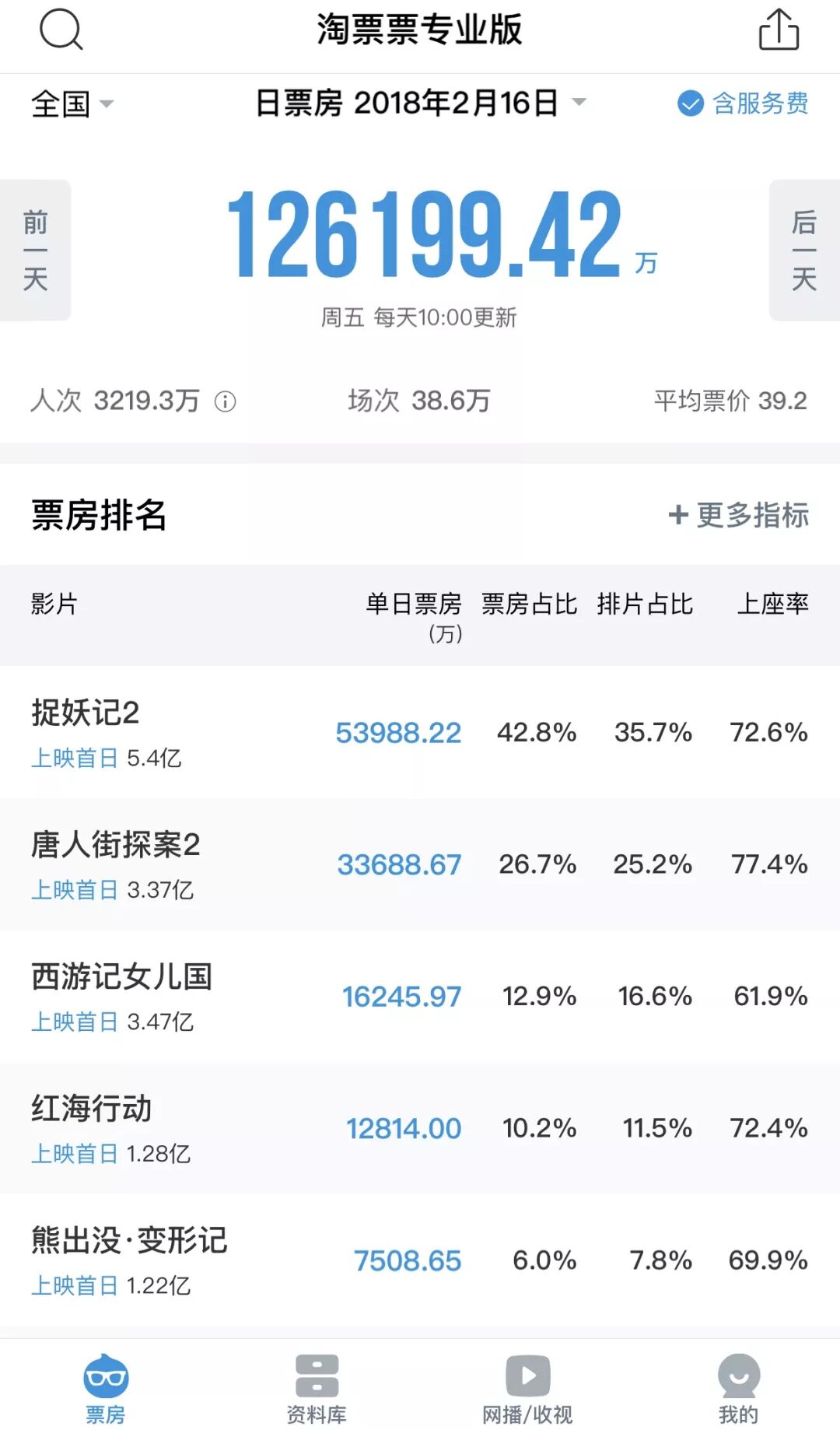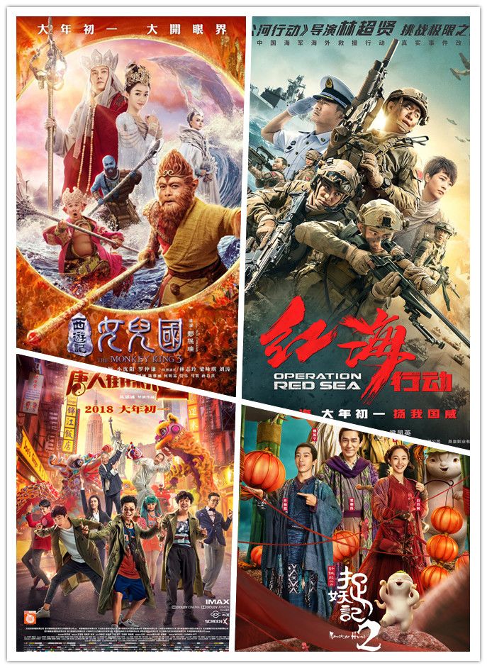2018大年初一,电影票房12.62亿,相比去年增加了5亿多,也打破了全球单日票房的世界纪录。头部电影集体发力,《捉妖记2》《唐人街探案2》《西游记女儿国》《红海行动》四部大片强势开画,上座率普遍在60%以上,《唐人街探案2》更是高达70%以上。