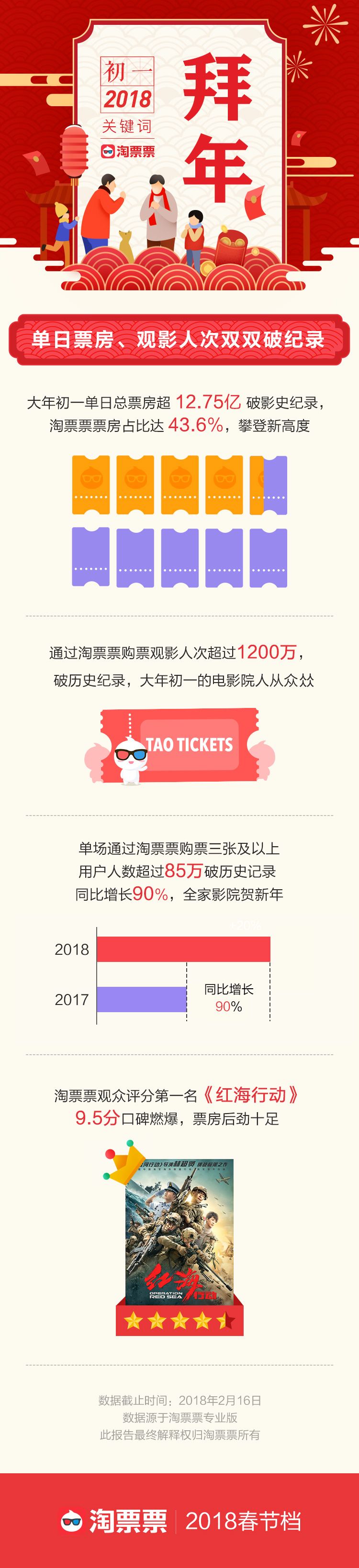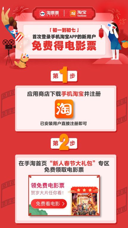 从初一到初七,淘票票联合淘宝,共同推出手淘新用户免费送票活动。这是淘票票与淘宝为配合春节档而在2018年进行的首次联合推广。