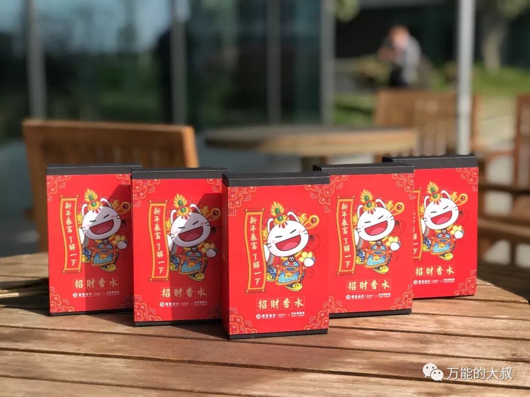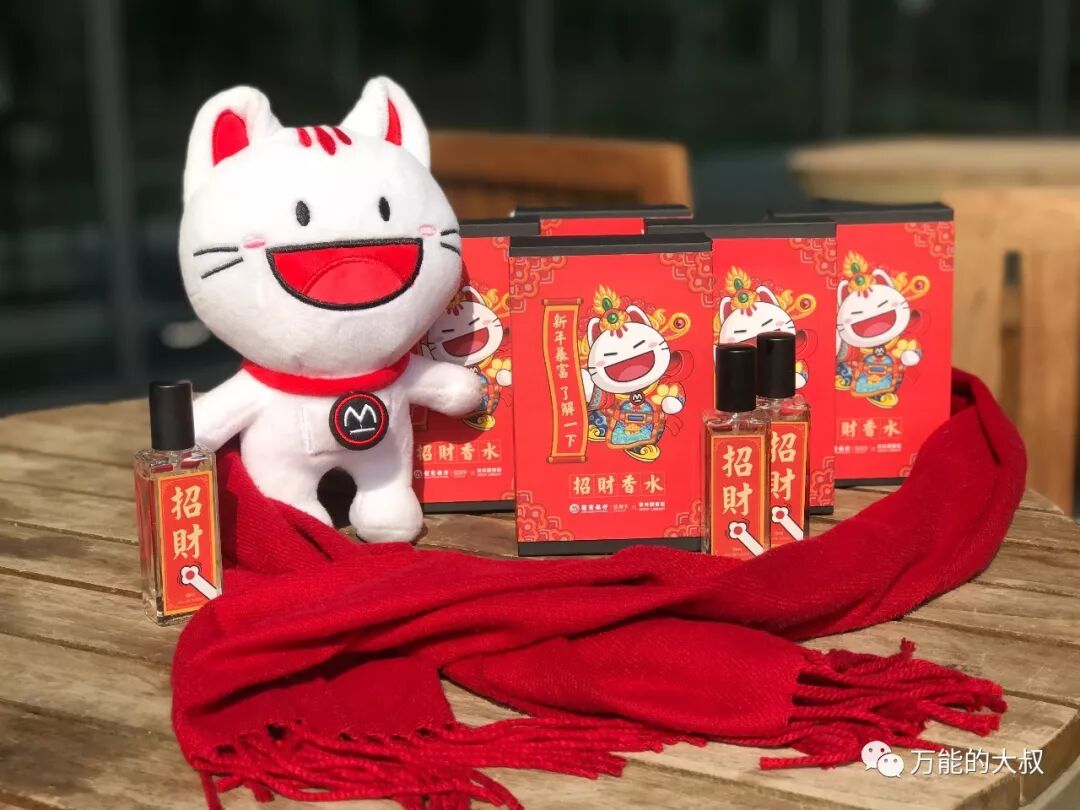 当然,外包装也相当重要。招财香水装在精致的招行红礼盒中,瓶身上写着吉祥的“招财”二字,还有一只可爱的小招喵猫爪为大家努力招财。