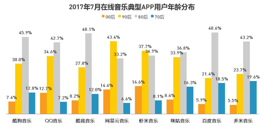 2、版权拓展:华研国际不仅在内容生产上实力雄厚,覆盖的音乐类型也更年轻化。而根据QuestMobile的数据统计,截止至2017年7月,在网易云音乐的用户群体中,90后、00后年轻群体占比合计58%,用户年轻化程度最高。这使得双方的受众群体易于融合,在内容生产与运营方面的理念契合度更高。