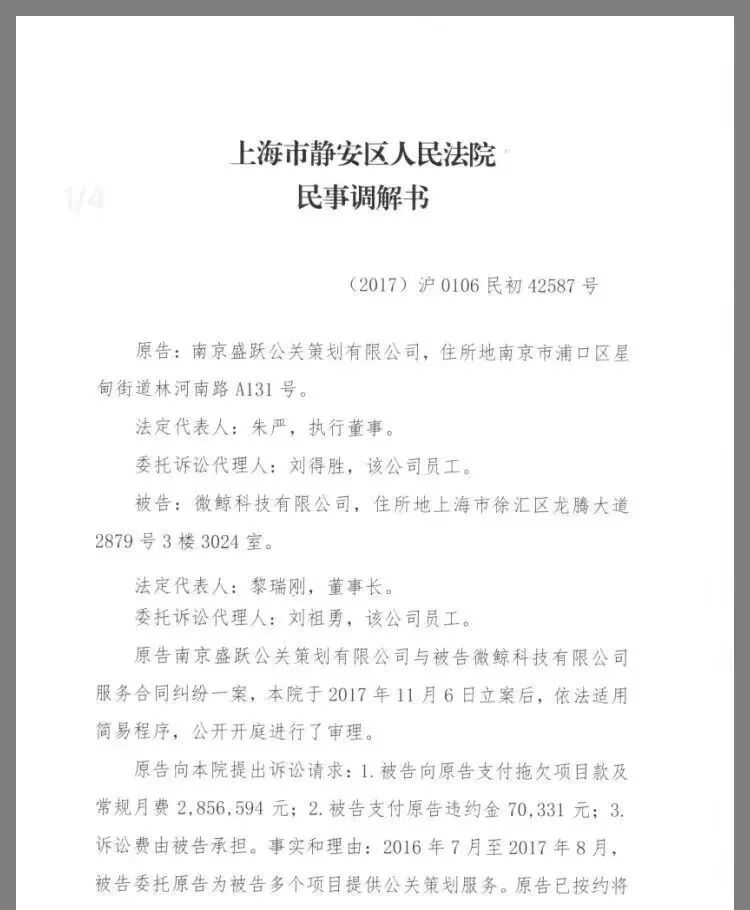 根据曝料内容,2017年11月,盛跃公关与微鲸科技在上海市静安区人民法院的主持下达成法律调解。尽管微鲸科技要求必须拿到60万所谓“企业返点”后再将余款分期付清,盛跃公关也迫于公司资金压力“认怂”同意,但是,直到今年2月,微鲸科技却对尚未偿还的84万余款置之不理。
