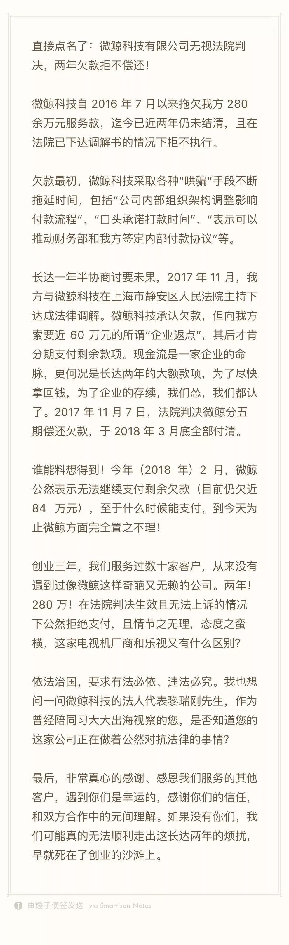 “微鲸科技无视法院判决,两年欠款280万拒不偿还!”