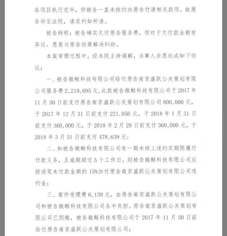 3月12日,盛跃公关某员工在朋友圈曝料:自2016年7月以来,微鲸科技拖欠盛跃公关服务款已超280万,迄今已近两年仍未结清,且在法院已下达调解书的情况下拒不执行。