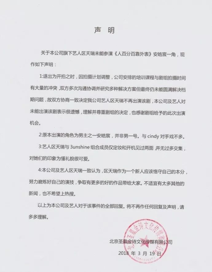 3月19日,区天瑞所在公司圣凰金诗发布声明回应此事,称区天瑞的退出是由于拍摄时间与上课时间冲突太大。同时也澄清区天瑞在剧中只是男主之一安皓辰,且与Cindy的对手戏并不多。