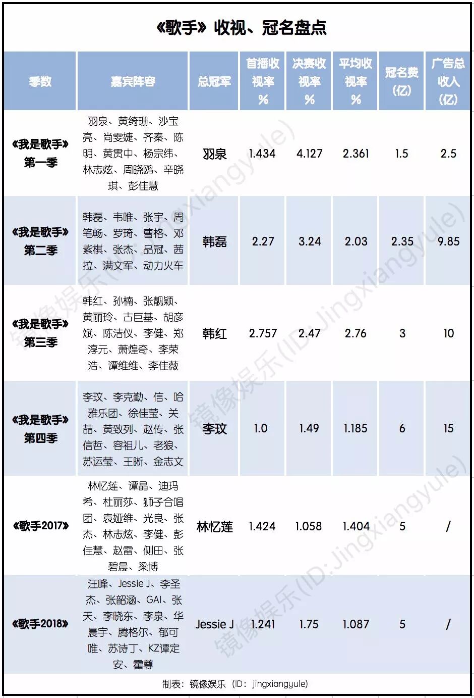 可以看出,《我是歌手》收视率在第一季从首播的1.434%到决赛的4.127%,一路低开高走,在第二季和第三季迎来了巅峰,在第四季跌至低谷,而更名为《歌手》后,平均收视只是较低谷期略有增长,并未回春。而《歌手2018》,更是诞下了6季以来的最低平均收视率。