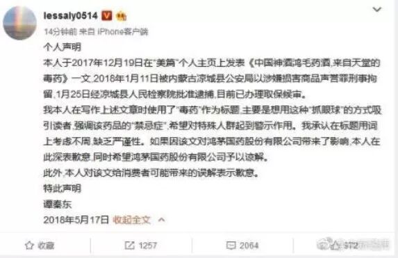 昨天下午,鸿茅药酒事件的当事人谭秦东,道歉了。
