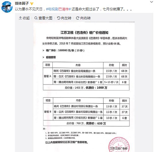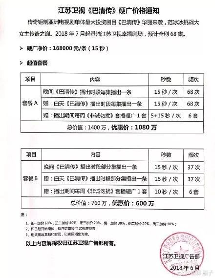 随后,微博@媒体圈子曝出江苏卫视《巴清传》的硬广定价。其中单条广告16.8万/15秒,单个广告商投放套餐价格在600万至1080万之间。