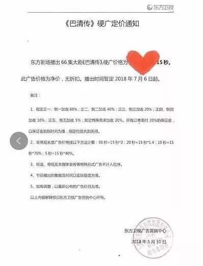 尽管东方卫视流出的《巴清传》硬广价格被抹去,但是,江苏卫视的硬广报价在不久后流出:硬广净价为16.8万/条(15秒)。