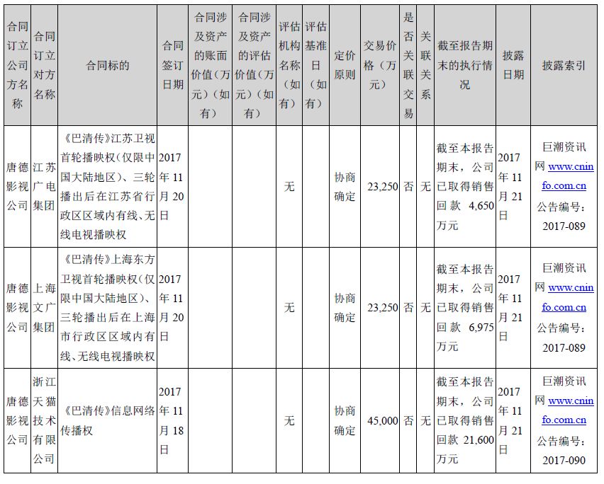 《巴清传》首轮版权费合计收入9.15亿元,投入产出比为183%。其中有3.32亿已经回款,占唐德影视2017年电视剧业务收入的30%,为该报告期内盈利能力最强的项目。