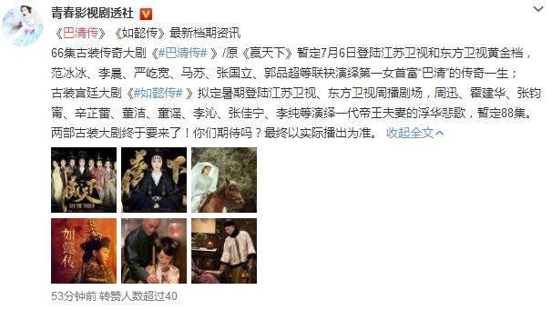 另外,微博也有多个大V的爆料,《巴清传》的主角由李晨顶替高云翔,剧情从72集删减为66集。而几乎同时,另一古装大剧《如懿传》也传出定档消息:拟定在今年暑期登陆江苏卫视、东方卫视的周播剧场,暂定88集。